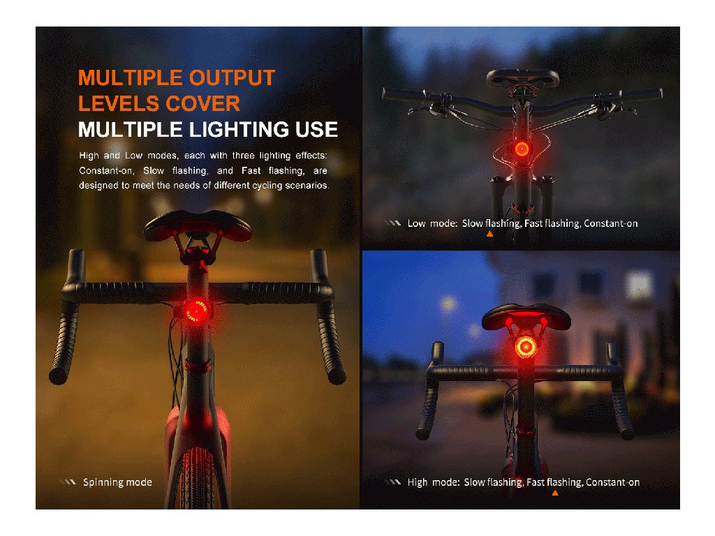 Funkcia brzdového svetla - pokiaľ pri zapnutom svetle dôjde k náhlej zmene rýchlosti, tak svietidlo automaticky aktivuje brzdové svetlo 90 lúmenov. Po dvoch sekundách sa svetlo automaticky vráti do predchádzajúceho režimu svietenia.