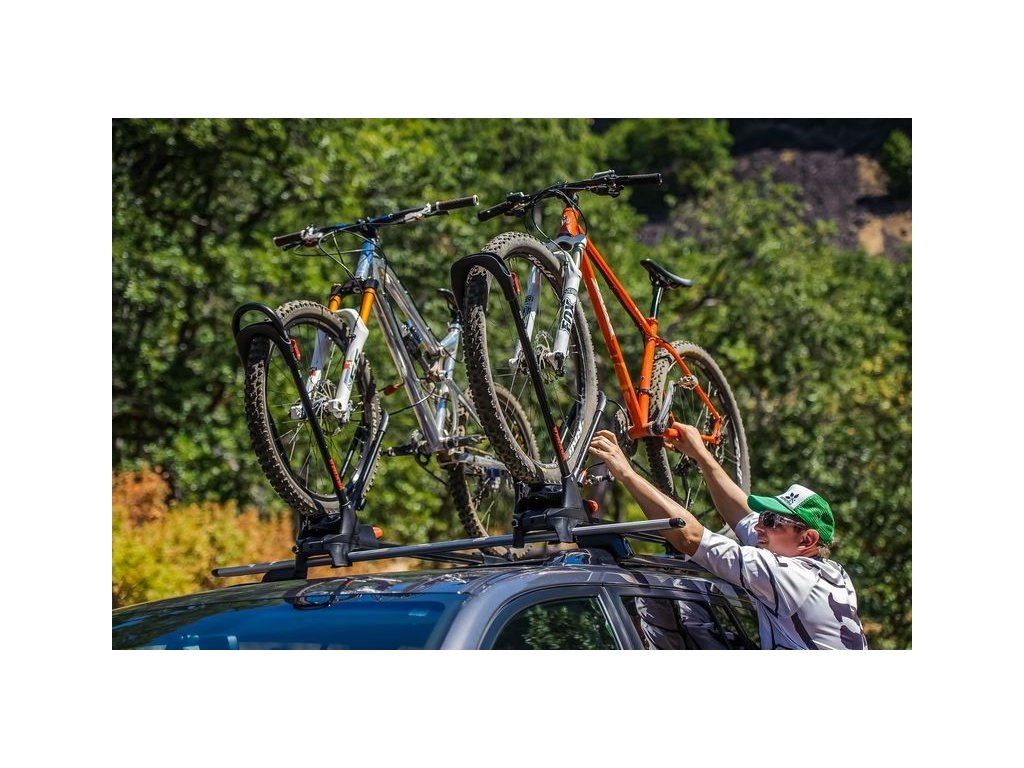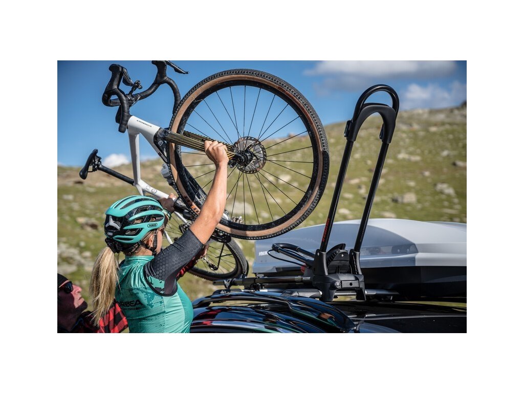 Novinka strešných nosičov s uchytením o predné koleso. Bicykel je uchytený v 3 bodoch čeľusťovým zovretím prednej pneumatiky. Bicykel stačí jednoducho vložiť do držiaku a zaistiť predné a zadné koleso.